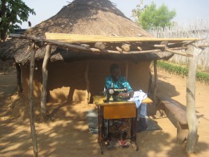 Eine Schneiderin bei der Arbeit. Sie arbeitet mit Frauenpower und nicht mit electric power.