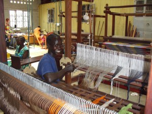 Die neuen Kettfäden werden mit den „alten“ zusammengeknüpft, damit weitergewebt werden kann.